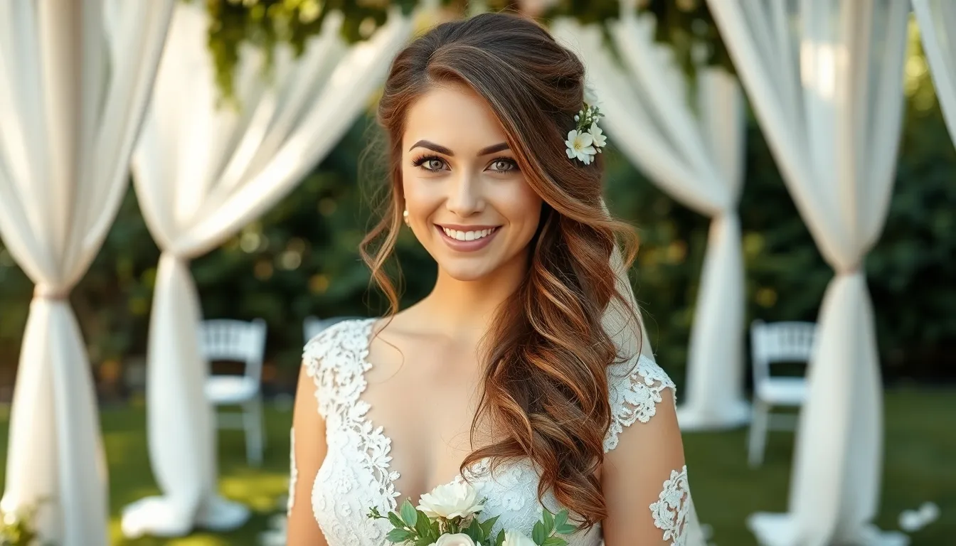 Brides with medium-length hair often favor half up half down hairstyles for their elegance and adaptability. Several styles capture the essence of a wedding celebration while enhancing the overall look.