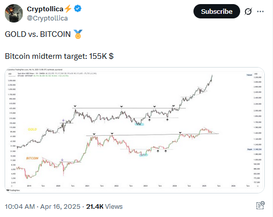 Then there are analysts like Cryptollica, who focus on how Bitcoin sometimes lags behind gold’s big moves. They see gold hitting new records recently while Bitcoin was still consolidating, suggesting BTC might just be getting ready for its own catch-up rally. If Bitcoin starts following gold’s recent powerful uptrend, Cryptollica’s charts suggest a possible target around $155,000.